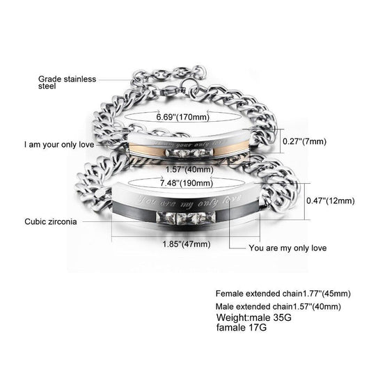 1 Pair Lovers' Cubic Zirconia Link Chain Bracelets Vintage Black/Gold Color Stainless Steel Women Men Jewelry Gift
