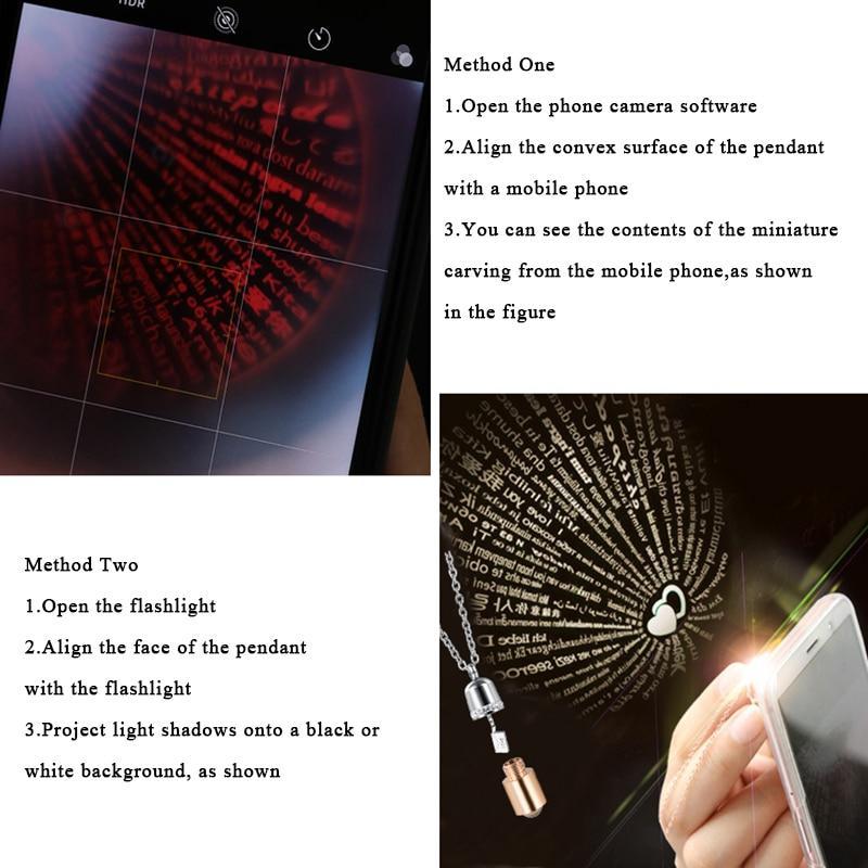 Just illuminating the pendant with light, 100 languages of I love you will be displayed. Great gifts for girlfriend, mom, wife, daughter, best friend, etc. Ideal Birthday Gifts, Anniversary Gifts, Christmas Gifts, Graduation Gifts, Mother's Day Gifts, Valentine's Day Gifts, etc, or just as a surprise to remind that special one how much you care.