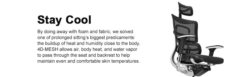 - STAY COOL – By doing away with foam and fabric, we solved one of prolonged sitting’s biggest predicaments: the buildup of heat and humidity close to the body. 4D-MESH covering allows air, body heat, and water vapor to pass through the seat and backrest to help maintain even and comfortable skin temperatures.