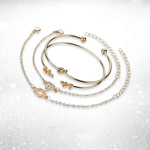 This 4 piece set features a leaves bangle, knot bangle, diamond bracelet, and geo circle bracelet - perfect to wear alone or with a watch!
