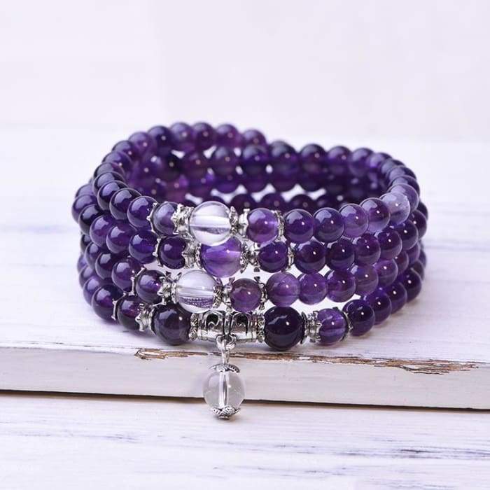 This Amethyst Buddhist Mala Bracelet has the power to transform energies at all levels, and in particular energies specific to the 6th and 7th Chakras, i.e. the Third Eye (located at the forehead) and the Coronal Chakra (located at the top skull).