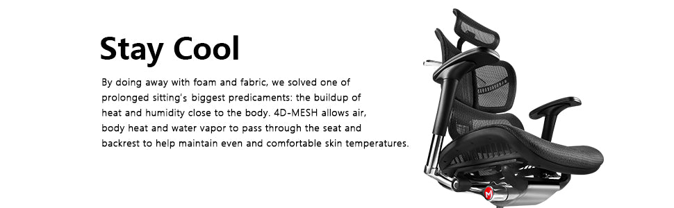 Keeping Cool - Removing foam and tissue has solved one of the greatest dilemmas of sitting for a long time: the accumulation of heat and moisture near the body. The 4D mesh cloth allows air, body heat and water vapor to be drained through the seat and backrest to maintain an even and pleasant skin temperature.
