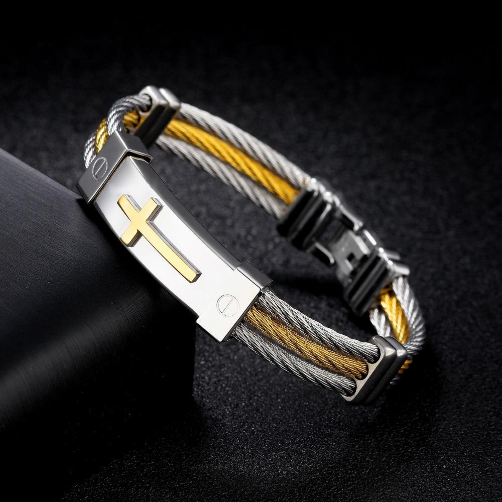 Wire Rope Cross Bangles For Men Three Layers Stainless Steel Gold Color Male Charm Cable Bracelet Jewelry Gift