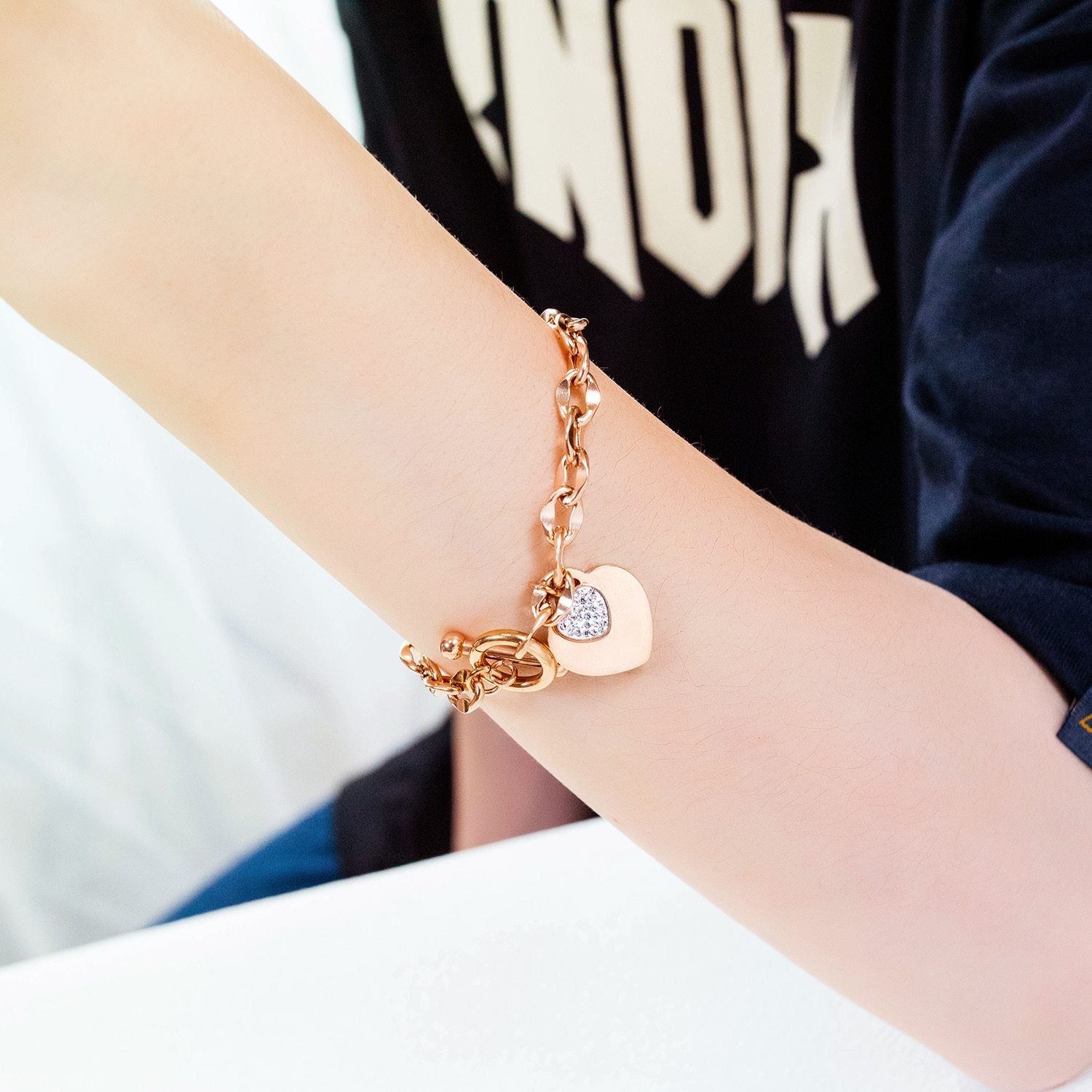 Women Bracelet Link Rose Gold Tone Crystal Love Heart Tag Engrave Toggle Clasp Designer Charm Stainless Chain Bangle